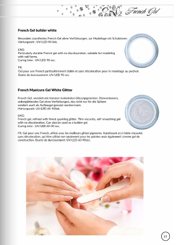 A very thin, extremely opaque white French Gel, which was developed for French gel, refined with finest sparkling glitter. Thin viscosity, self-smoothing gel
