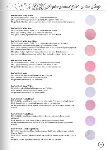 Milky, Matt und Effekttöne. ENG: lightly covering Finish Gel in a slightly transparent white tone.