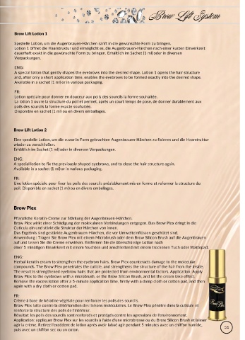 shaped eyebrows. On the one hand, the Brow Lift System tames the unruly hairs on the eyebrows, and on the Eine spezielle Lotion, um die zuvor in Form gebrachten Augenbrauen-Härchen zu fixieren und die Haarstruktur